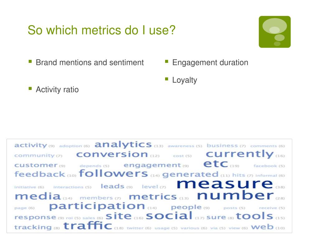 So which metrics do I use? • Brand mentions and sentiment • Activity ratio • Engagement duration • Loyalty