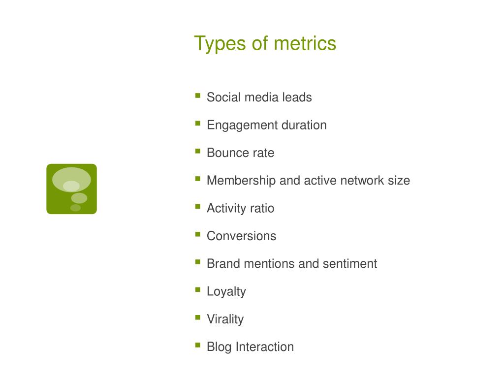 Types of metrics Social media leads Engagement duration Bounce rate Membership and active network size Activity ratio Conversions Brand mentions and sentiment Loyalty Virality Blog Interaction