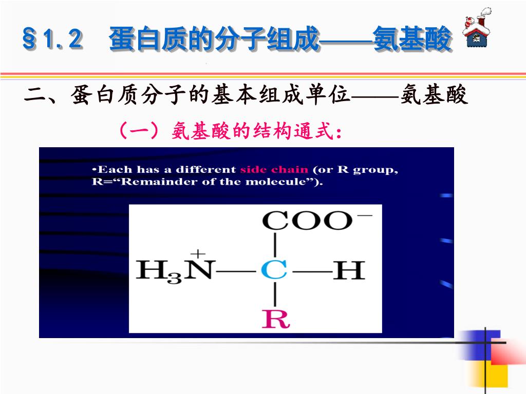 §1.2 蛋白质的分子组成——氨基酸 二、蛋白质分子的基本组成单位——氨基酸 (一)氨基酸的结构通式: