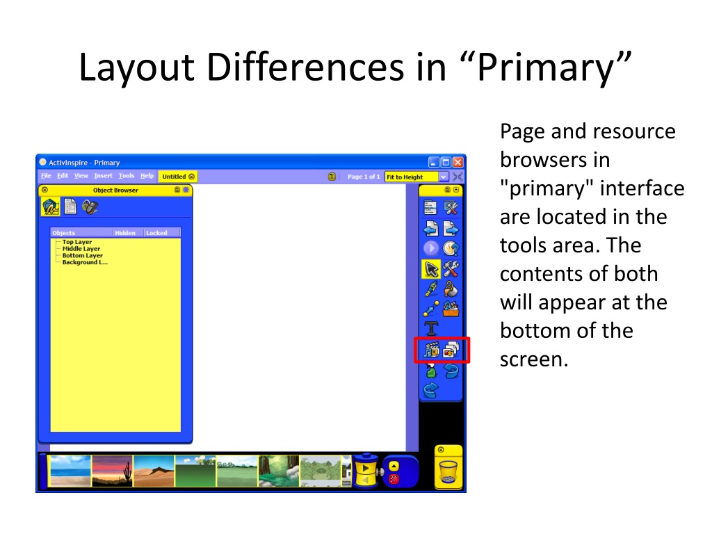 Layout Differences in “Primary” Page and resource browsers in "primary" interface are located in the tools area. The contents of both will appear at the bottom of the screen.