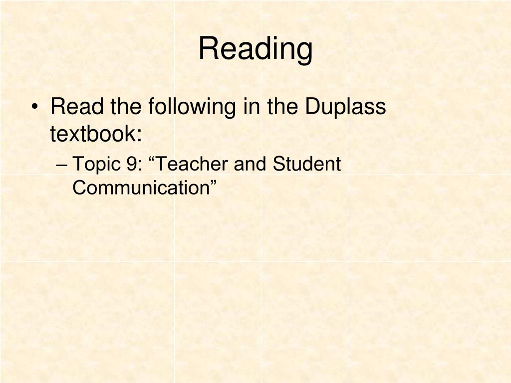 Reading • Read the following in the Duplass textbook: • Topic 9: “Teacher and Student Communication”