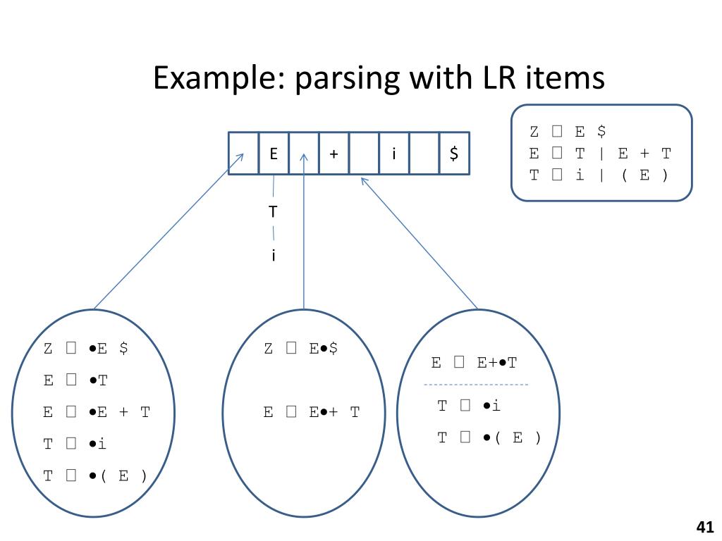 Example: parsing with LR items Z E $ E T | E + T T i | ( E ) i + i $ Match items with current token Z E $ T i Reduce item! E T E E + T T i T ( E )