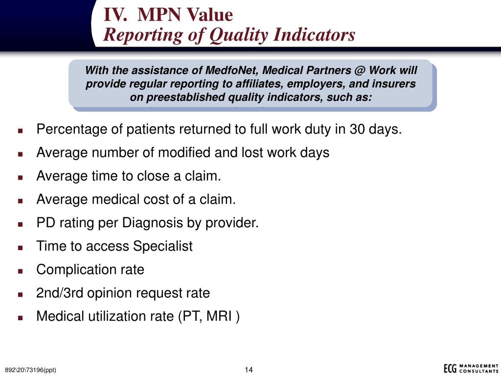 IV. MPN ValueReporting of Quality Indicators With the assistance of MedfoNet, Medical Partners @ Work will provide regular reporting to affiliates, employers, and insurers on preestablished quality indicators, such as: • Percentage of patients returned to full work duty in 30 days. • Average number of modified and lost work days • Average time to close a claim. • Average medical cost of a claim. • PD rating per Diagnosis by provider. • Time to access Specialist • Complication rate • 2nd/3rd opinion request rate • Medical utilization rate (PT, MRI ) 892\20\73196(ppt)