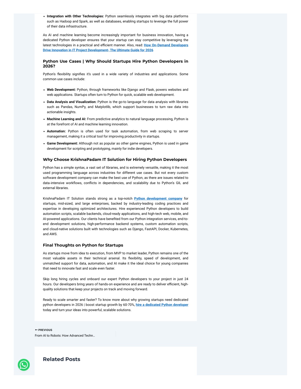 Integration with Other Technologies: Python seamlessly integrates with big data platforms such as Hadoop and Spark, as well as databases, enabling startups to leverage the full power of their data infrastructure. As AI and machine learning become increasingly important for business innovation, having a dedicated Python developer ensures that your startup can stay competitive by leveraging the latest technologies in a practical and e?cient manner. Also, read: How On-Demand Developers Drive Innovation in IT Project Development- The Ultimate Guide for 2026 Python Use Cases | Why Should Startups Hire Python Developers in 2026? Python’s ?exibility signi?es it’s used in a wide variety of industries and applications. Some common use cases include: Web Development: Python, through frameworks like Django and Flask, powers websites and web applications. Startups often turn to Python for quick, scalable web development. Data Analysis and Visualization: Python is the go-to language for data analysis with libraries such as Pandas, NumPy, and Matplotlib, which support businesses to turn raw data into actionable insights. Machine Learning and AI: From predictive analytics to natural language processing, Python is at the forefront of AI and machine learning innovation. Automation: Python is often used for task automation, from web scraping to server management, making it a critical tool for improving productivity in startups. Game Development: Although not as popular as other game engines, Python is used in game development for scripting and prototyping, mainly for indie developers. Why Choose KrishnaPadam IT Solution for Hiring Python Developers Python has a simple syntax, a vast set of libraries, and is extremely versatile, making it the most used programming language across industries for different use cases. But not every custom software development company can make the best use of Python, as there are issues related to data‑intensive work?ows, con?icts in dependencies, and scalability due to Python’s GIL and external libraries. KrishnaPadam IT Solution stands strong as a top-notch Python development company for startups, mid-sized, and large enterprises, backed by industry-leading coding practices and expertise in developing optimized architectures. Hire experienced Python developers to build automation scripts, scalable backends, cloud-ready applications, and high-tech web, mobile, and AI-powered applications. Our clients have bene?ted from our Python integration services, end-to- end development solutions, high-performance backend systems, custom automation scripts, and cloud-native solutions built with technologies such as Django, FastAPI, Docker, Kubernetes, and AWS. Final Thoughts on Python for Startups As startups move from idea to execution, from MVP to market leader, Python remains one of the most valuable assets in their technical arsenal. Its ?exibility, speed of development, and unmatched support for data, automation, and AI make it the ideal choice for young companies that need to innovate fast and scale even faster. Skip long hiring cycles and onboard our expert Python developers to your project in just 24 hours. Our developers bring years of hands-on experience and are ready to deliver e?cient, high- quality solutions that keep your projects on track and moving forward. Ready to scale smarter and faster? To know more about why growing startups need dedicated python developers in 2026 | boost startup growth by 60-70%, hire a dedicated Python developer today and turn your ideas into powerful, scalable solutions. PREVIOUS From AI to Robots: How Advanced Techn… Related Posts