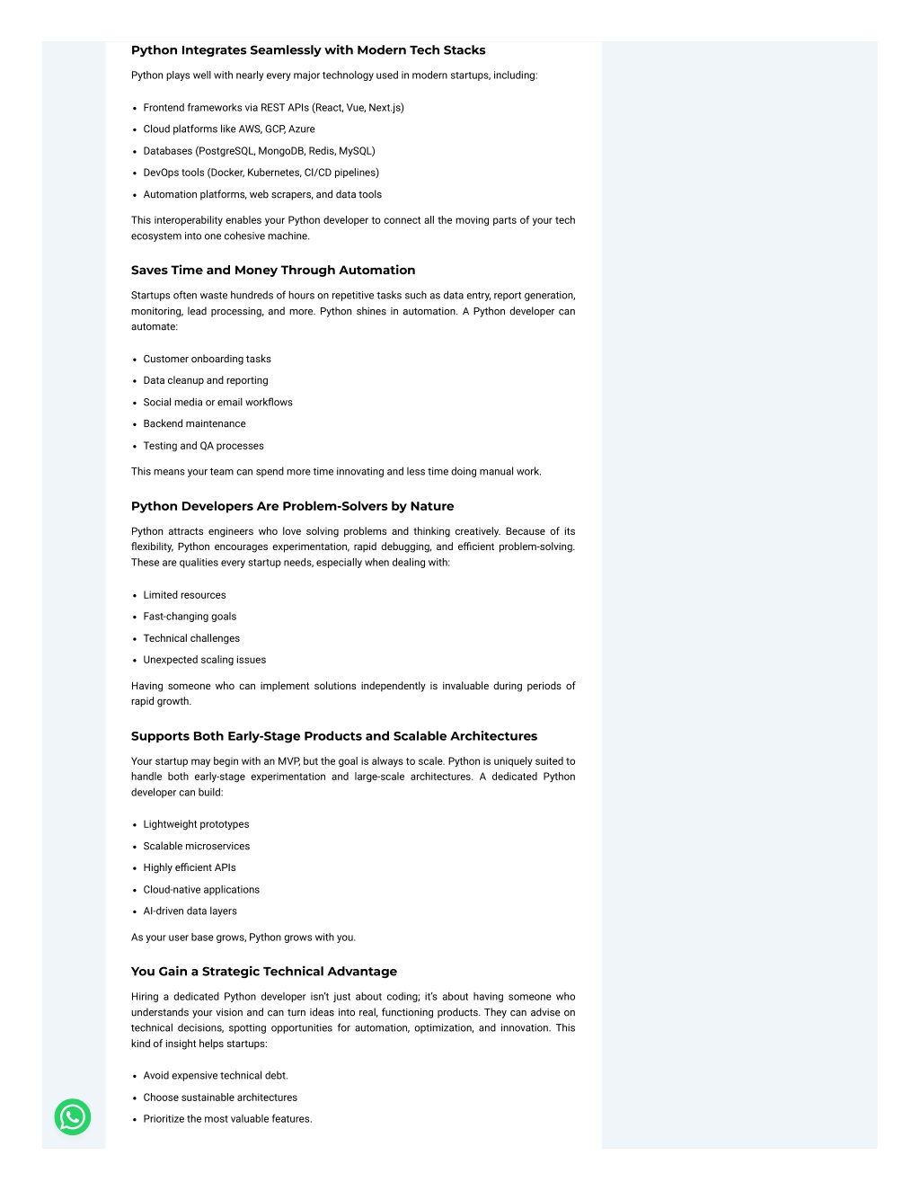 Python Integrates Seamlessly with Modern Tech Stacks Python plays well with nearly every major technology used in modern startups, including: Frontend frameworks via REST APIs (React, Vue, Next.js) Cloud platforms like AWS, GCP, Azure Databases (PostgreSQL, MongoDB, Redis, MySQL) DevOps tools (Docker, Kubernetes, CI/CD pipelines) Automation platforms, web scrapers, and data tools This interoperability enables your Python developer to connect all the moving parts of your tech ecosystem into one cohesive machine. Saves Time and Money Through Automation Startups often waste hundreds of hours on repetitive tasks such as data entry, report generation, monitoring, lead processing, and more. Python shines in automation. A Python developer can automate: Customer onboarding tasks Data cleanup and reporting Social media or email work?ows Backend maintenance Testing and QA processes This means your team can spend more time innovating and less time doing manual work. Python Developers Are Problem-Solvers by Nature Python attracts engineers who love solving problems and thinking creatively. Because of its ?exibility, Python encourages experimentation, rapid debugging, and e?cient problem-solving. These are qualities every startup needs, especially when dealing with: Limited resources Fast-changing goals Technical challenges Unexpected scaling issues Having someone who can implement solutions independently is invaluable during periods of rapid growth. Supports Both Early-Stage Products and Scalable Architectures Your startup may begin with an MVP, but the goal is always to scale. Python is uniquely suited to handle both early-stage experimentation and large-scale architectures. A dedicated Python developer can build: Lightweight prototypes Scalable microservices Highly e?cient APIs Cloud-native applications AI-driven data layers As your user base grows, Python grows with you. You Gain a Strategic Technical Advantage Hiring a dedicated Python developer isn’t just about coding; it’s about having someone who understands your vision and can turn ideas into real, functioning products. They can advise on technical decisions, spotting opportunities for automation, optimization, and innovation. This kind of insight helps startups: Avoid expensive technical debt. Choose sustainable architectures Prioritize the most valuable features.