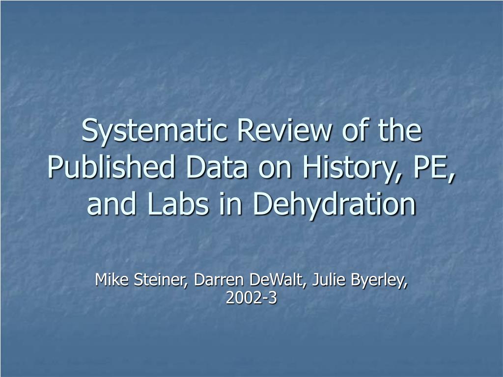 Systematic Review of the Published Data on History, PE, and Labs in Dehydration Mike Steiner, Darren DeWalt, Julie Byerley, 2002-3