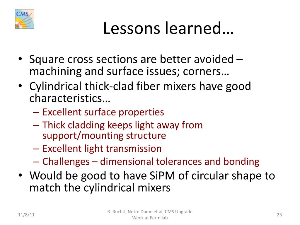 Lessons learned… • Square cross sections are better avoided – machining and surface issues; corners… • Cylindrical thick-clad fiber mixers have good characteristics… • Excellent surface properties • Thick cladding keeps light away from support/mounting structure • Excellent light transmission • Challenges – dimensional tolerances and bonding • Would be good to have SiPM of circular shape to match the cylindrical mixers R. Ruchti, Notre Dame et al, CMS Upgrade Week at Fermilab