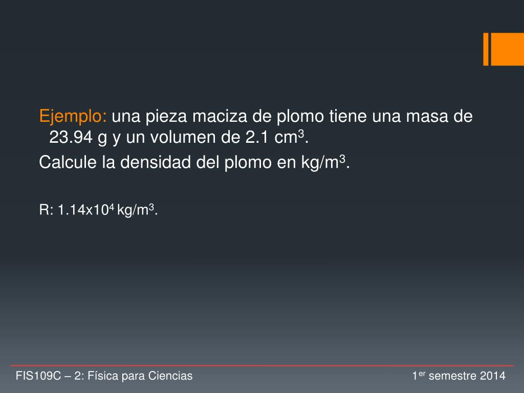 Ejemplo: una pieza maciza de plomo tiene una masa de 23.94 g y un volumen de 2.1 cm3. Calcule la densidad del plomo en kg/m3. R: 1.14x104 kg/m3. FIS109C – 2: Física para Ciencias 1er semestre 2014