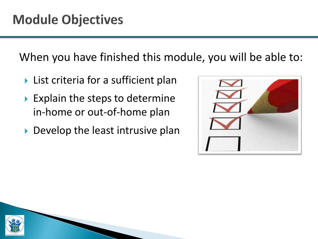 Module Objectives When you have finished this module, you will be able to: • List criteria for a sufficient plan • Explain the steps to determine in-home or out-of-home plan • Develop the least intrusive plan