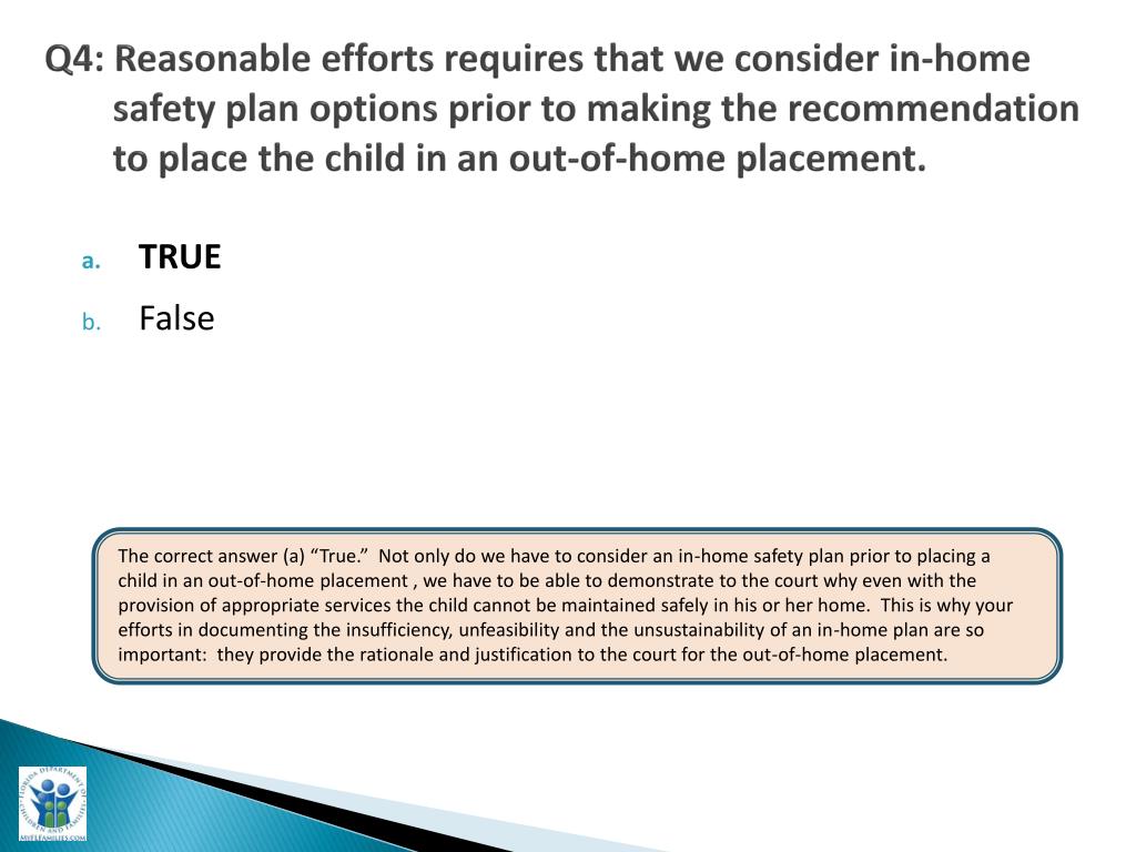 Q4: Reasonable efforts requires that we consider in-home safety plan options prior to making the recommendation to place the child in an out-of-home placement. • TRUE • False The correct answer (a) “True.” Not only do we have to consider an in-home safety plan prior to placing a child in an out-of-home placement , we have to be able to demonstrate to the court why even with the provision of appropriate services the child cannot be maintained safely in his or her home. This is why your efforts in documenting the insufficiency, unfeasibility and the unsustainability of an in-home plan are so important: they provide the rationale and justification to the court for the out-of-home placement.