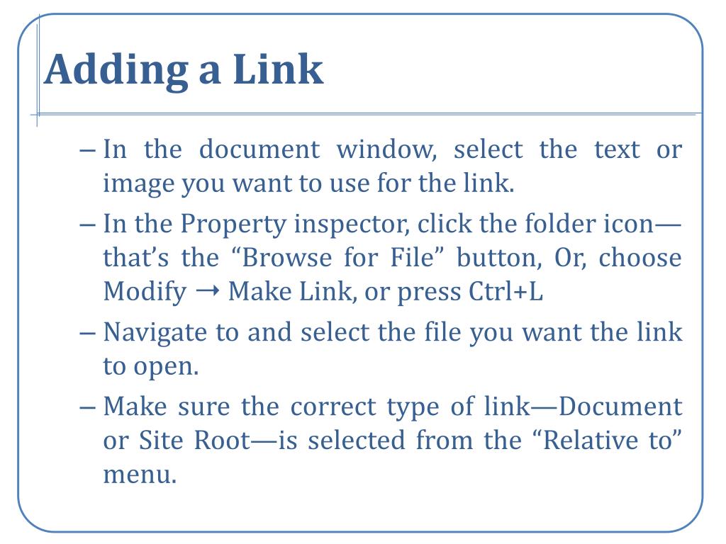 Adding a Link • In the document window, select the text or image you want to use for the link. • In the Property inspector, click the folder icon—that’s the “Browse for File” button, Or, choose Modify ➝ Make Link, or press Ctrl+L • Navigate to and select the file you want the link to open. • Make sure the correct type of link—Document or Site Root—is selected from the “Relative to” menu.