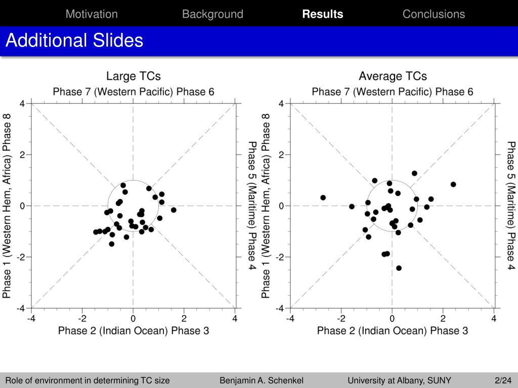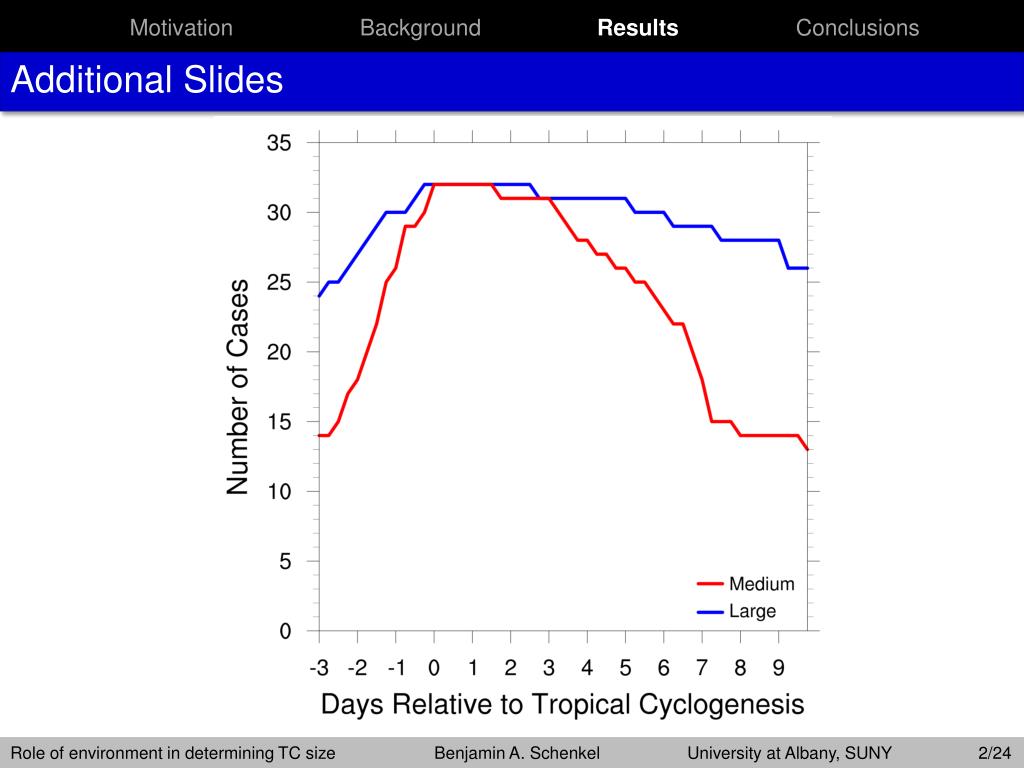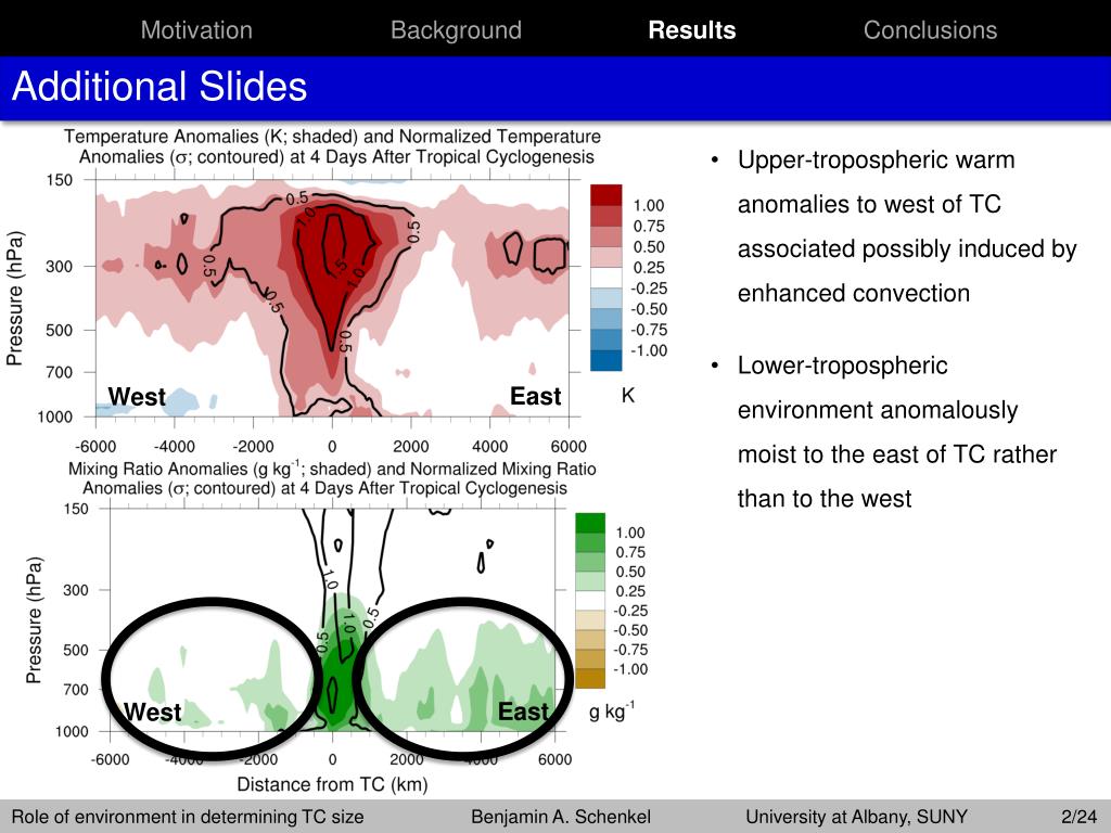 Motivation • Background • Results • Conclusions Additional Slides • Upper-tropospheric warm anomalies to west of TC associated possibly induced by enhanced convection • Lower-tropospheric environment anomalously moist to the east of TC rather than to the west • East • West large-scale response of environment to TC passage similar to TC Yuri • East • West Role of environment in determining TC size Benjamin A. Schenkel University at Albany, SUNY 2/24