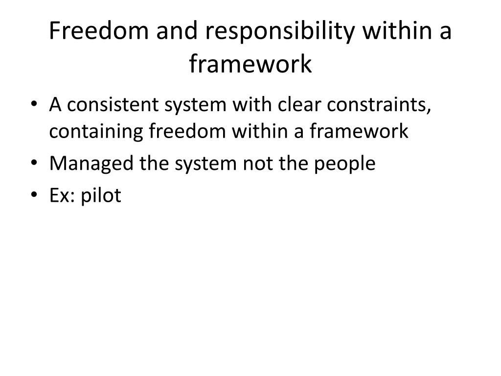 Freedom and responsibility within a framework • A consistent system with clear constraints, containing freedom within a framework • Managed the system not the people • Ex: pilot
