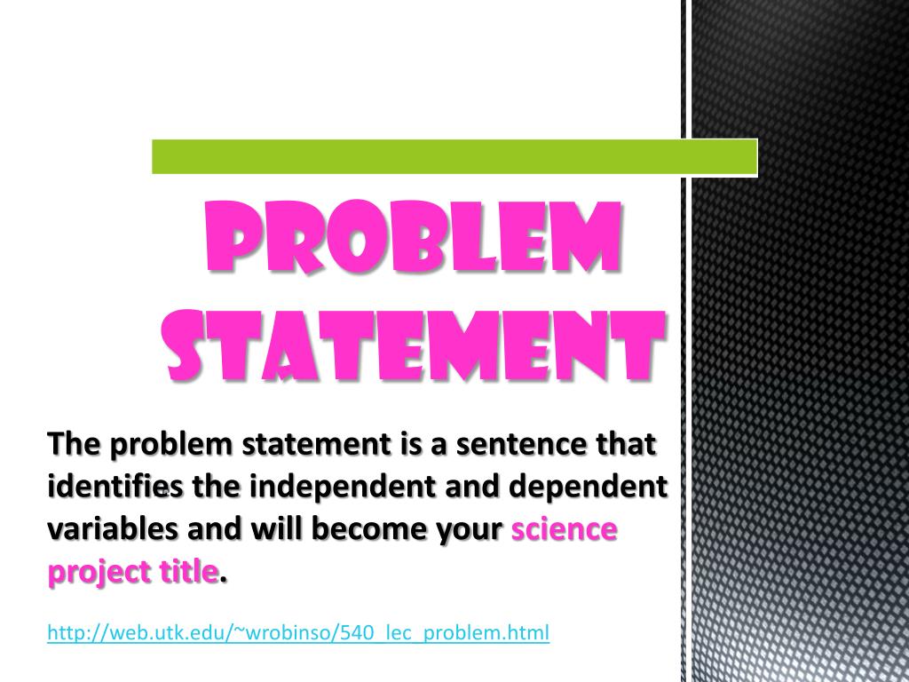 PROBLEM STATEMENT i.e. The problem statement is a sentence that identifies the independent and dependent variables and will become your science project title. http://web.utk.edu/~wrobinso/540_lec_problem.html