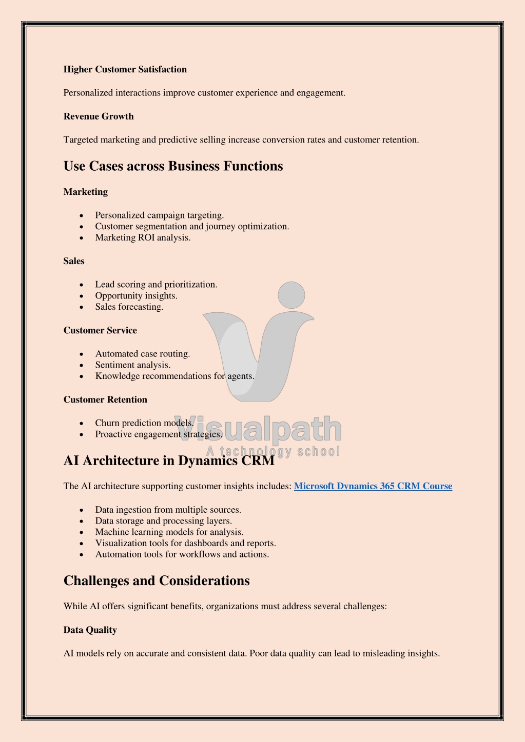 Higher Customer Satisfaction Personalized interactions improve customer experience and engagement. Revenue Growth Targeted marketing and predictive selling increase conversion rates and customer retention. Use Cases across Business Functions Marketing Personalized campaign targeting. Customer segmentation and journey optimization. Marketing ROI analysis. Sales Lead scoring and prioritization. Opportunity insights. Sales forecasting. Customer Service Automated case routing. Sentiment analysis. Knowledge recommendations for agents. Customer Retention Churn prediction models. Proactive engagement strategies. AI Architecture in Dynamics CRM The AI architecture supporting customer insights includes: Microsoft Dynamics 365 CRM Course Data ingestion from multiple sources. Data storage and processing layers. Machine learning models for analysis. Visualization tools for dashboards and reports. Automation tools for workflows and actions. Challenges and Considerations While AI offers significant benefits, organizations must address several challenges: Data Quality AI models rely on accurate and consistent data. Poor data quality can lead to misleading insights.