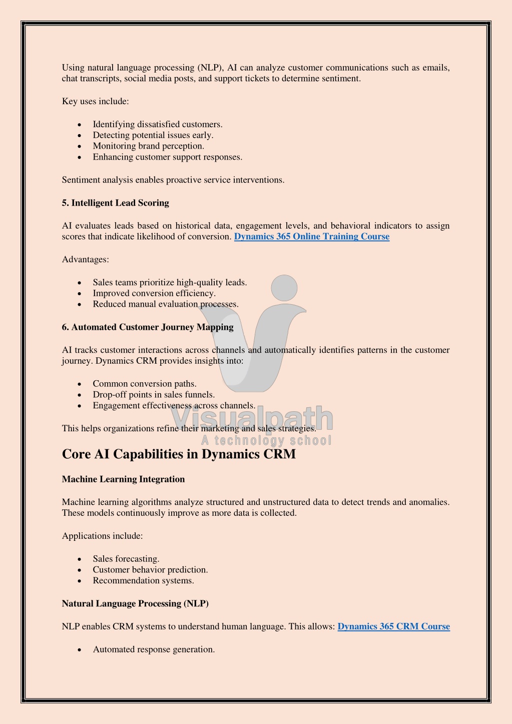 Using natural language processing (NLP), AI can analyze customer communications such as emails, chat transcripts, social media posts, and support tickets to determine sentiment. Key uses include: Identifying dissatisfied customers. Detecting potential issues early. Monitoring brand perception. Enhancing customer support responses. Sentiment analysis enables proactive service interventions. 5. Intelligent Lead Scoring AI evaluates leads based on historical data, engagement levels, and behavioral indicators to assign scores that indicate likelihood of conversion. Dynamics 365 Online Training Course Advantages: Sales teams prioritize high-quality leads. Improved conversion efficiency. Reduced manual evaluation processes. 6. Automated Customer Journey Mapping AI tracks customer interactions across channels and automatically identifies patterns in the customer journey. Dynamics CRM provides insights into: Common conversion paths. Drop-off points in sales funnels. Engagement effectiveness across channels. This helps organizations refine their marketing and sales strategies. Core AI Capabilities in Dynamics CRM Machine Learning Integration Machine learning algorithms analyze structured and unstructured data to detect trends and anomalies. These models continuously improve as more data is collected. Applications include: Sales forecasting. Customer behavior prediction. Recommendation systems. Natural Language Processing (NLP) NLP enables CRM systems to understand human language. This allows: Dynamics 365 CRM Course Automated response generation.