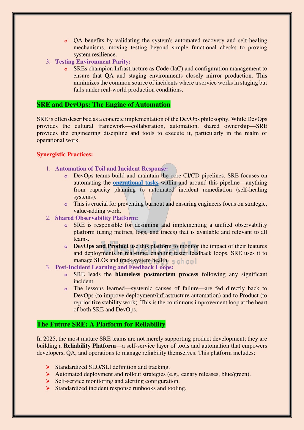 oQA benefits by validating the system's automated recovery and self-healing mechanisms, moving testing beyond simple functional checks to proving system resilience. 3.Testing Environment Parity: oSREs champion Infrastructure as Code (IaC) and configuration management to ensure that QA and staging environments closely mirror production. This minimizes the common source of incidents where a service works in staging but fails under real-world production conditions. SRE and DevOps: The Engine of Automation SRE is often described as a concrete implementation of the DevOps philosophy. While DevOps provides the cultural framework—collaboration, automation, shared ownership—SRE provides the engineering discipline and tools to execute it, particularly in the realm of operational work. Synergistic Practices: 1.Automation of Toil and Incident Response: oDevOps teams build and maintain the core CI/CD pipelines. SRE focuses on automating the operational tasks within and around this pipeline—anything from capacity planning to automated incident remediation (self-healing systems). oThis is crucial for preventing burnout and ensuring engineers focus on strategic, value-adding work. 2.Shared Observability Platform: oSRE is responsible for designing and implementing a unified observability platform (using metrics, logs, and traces) that is available and relevant to all teams. oDevOps and Product use this platform to monitor the impact of their features and deployments in real-time, enabling faster feedback loops. SRE uses it to manage SLOs and track system health. 3.Post-Incident Learning and Feedback Loops: oSRE leads the blameless postmortem process following any significant incident. oThe lessons learned—systemic causes of failure—are fed directly back to DevOps (to improve deployment/infrastructure automation) and to Product (to reprioritize stability work). This is the continuous improvement loop at the heart of both SRE and DevOps. The Future SRE: A Platform for Reliability In 2025, the most mature SRE teams are not merely supporting product development; they are building a Reliability Platform—a self-service layer of tools and automation that empowers developers, QA, and operations to manage reliability themselves. This platform includes: Standardized SLO/SLI definition and tracking. Automated deployment and rollout strategies (e.g., canary releases, blue/green). Self-service monitoring and alerting configuration. Standardized incident response runbooks and tooling.