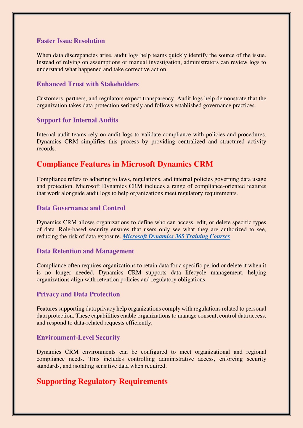 Faster Issue Resolution When data discrepancies arise, audit logs help teams quickly identify the source of the issue. Instead of relying on assumptions or manual investigation, administrators can review logs to understand what happened and take corrective action. Enhanced Trust with Stakeholders Customers, partners, and regulators expect transparency. Audit logs help demonstrate that the organization takes data protection seriously and follows established governance practices. Support for Internal Audits Internal audit teams rely on audit logs to validate compliance with policies and procedures. Dynamics CRM simplifies this process by providing centralized and structured activity records. Compliance Features in Microsoft Dynamics CRM Compliance refers to adhering to laws, regulations, and internal policies governing data usage and protection. Microsoft Dynamics CRM includes a range of compliance-oriented features that work alongside audit logs to help organizations meet regulatory requirements. Data Governance and Control Dynamics CRM allows organizations to define who can access, edit, or delete specific types of data. Role-based security ensures that users only see what they are authorized to see, reducing the risk of data exposure. Microsoft Dynamics 365 Training Courses Data Retention and Management Compliance often requires organizations to retain data for a specific period or delete it when it is no longer needed. Dynamics CRM supports data lifecycle management, helping organizations align with retention policies and regulatory obligations. Privacy and Data Protection Features supporting data privacy help organizations comply with regulations related to personal data protection. These capabilities enable organizations to manage consent, control data access, and respond to data-related requests efficiently. Environment-Level Security Dynamics CRM environments can be configured to meet organizational and regional compliance needs. This includes controlling administrative access, enforcing security standards, and isolating sensitive data when required. Supporting Regulatory Requirements
