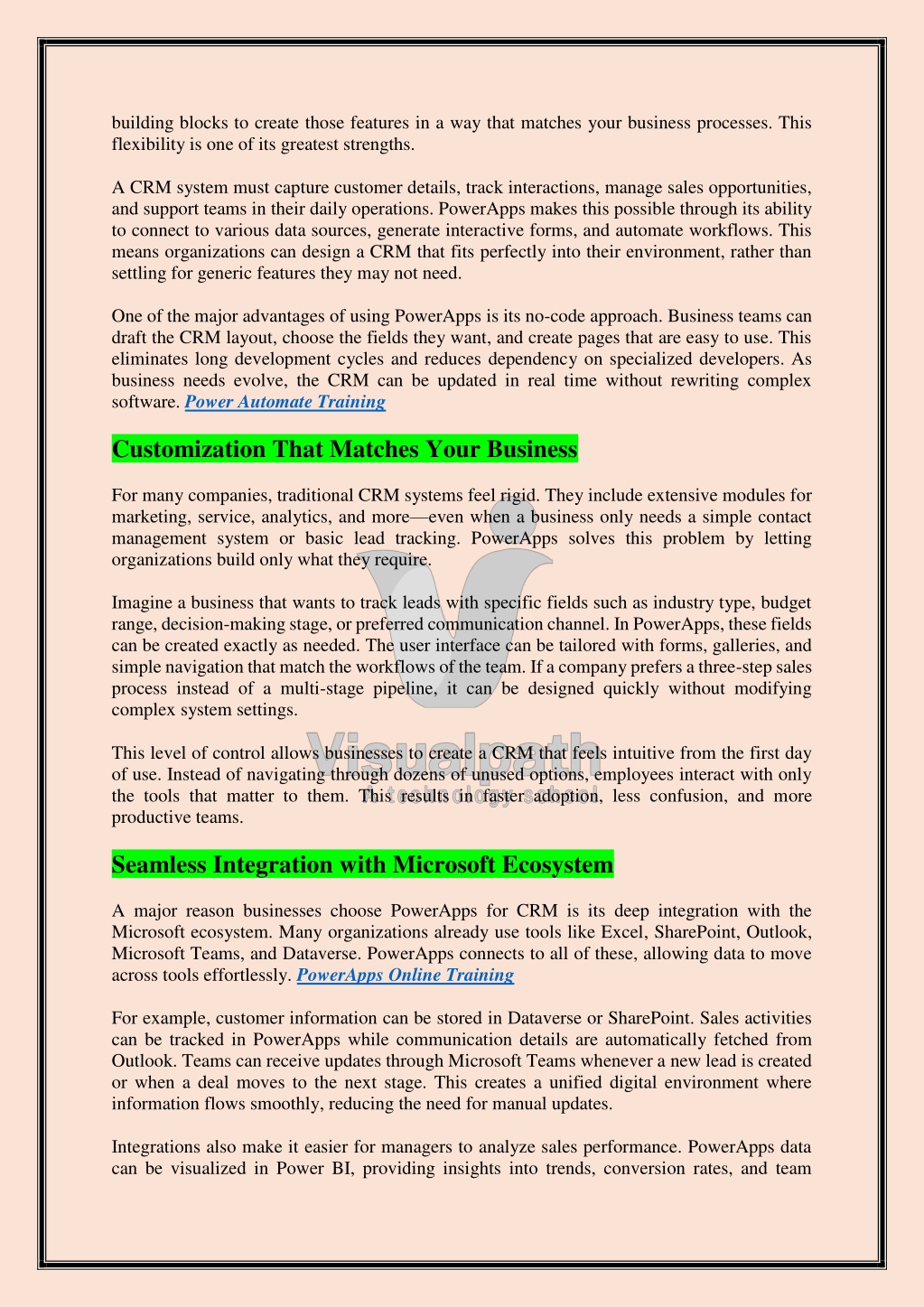 2. building blocks to create those features in a way that matches your business processes. This flexibility is one of its greatest strengths. A CRM system must capture customer details, track interactions, manage sales opportunities, and support teams in their daily operations. PowerApps makes this possible through its ability to connect to various data sources, generate interactive forms, and automate workflows. This means organizations can design a CRM that fits perfectly into their environment, rather than settling for generic features they may not need. One of the major advantages of using PowerApps is its no-code approach. Business teams can draft the CRM layout, choose the fields they want, and create pages that are easy to use. This eliminates long development cycles and reduces dependency on specialized developers. As business needs evolve, the CRM can be updated in real time without rewriting complex software. Power Automate Training Customization That Matches Your Business For many companies, traditional CRM systems feel rigid. They include extensive modules for marketing, service, analytics, and more—even when a business only needs a simple contact management system or basic lead tracking. PowerApps solves this problem by letting organizations build only what they require. Imagine a business that wants to track leads with specific fields such as industry type, budget range, decision-making stage, or preferred communication channel. In PowerApps, these fields can be created exactly as needed. The user interface can be tailored with forms, galleries, and simple navigation that match the workflows of the team. If a company prefers a three-step sales process instead of a multi-stage pipeline, it can be designed quickly without modifying complex system settings. This level of control allows businesses to create a CRM that feels intuitive from the first day of use. Instead of navigating through dozens of unused options, employees interact with only the tools that matter to them. This results in faster adoption, less confusion, and more productive teams. Seamless Integration with Microsoft Ecosystem A major reason businesses choose PowerApps for CRM is its deep integration with the Microsoft ecosystem. Many organizations already use tools like Excel, SharePoint, Outlook, Microsoft Teams, and Dataverse. PowerApps connects to all of these, allowing data to move across tools effortlessly. PowerApps Online Training For example, customer information can be stored in Dataverse or SharePoint. Sales activities can be tracked in PowerApps while communication details are automatically fetched from Outlook. Teams can receive updates through Microsoft Teams whenever a new lead is created or when a deal moves to the next stage. This creates a unified digital environment where information flows smoothly, reducing the need for manual updates. Integrations also make it easier for managers to analyze sales performance. PowerApps data can be visualized in Power BI, providing insights into trends, conversion rates, and team