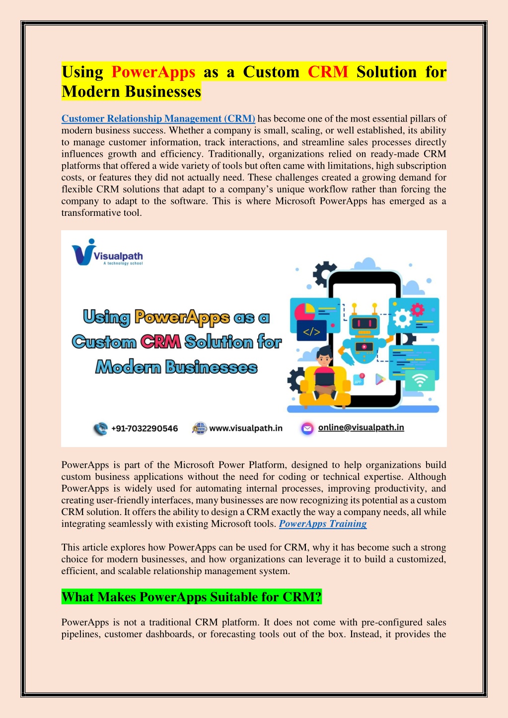 6. Scalability and Future-Proofing PowerApps is built on the Microsoft Azure cloud infrastructure, providing inherent scalability. As a company grows, the custom CRM solution can handle increased user loads and expanding data volumes without requiring fundamental architectural changes. The investment in a PowerApps solution is an investment in the entire Power Platform, meaning that the custom CRM can easily be extended later using other no-code tools, such as Power Automate (for workflow automation) or Power BI (for advanced analytics and dashboards), ensuring the solution remains current and adaptable for years to come. The Human Impact: Adoption and Ownership Perhaps the most significant difference between an off-the-shelf CRM and a custom PowerApps solution is the level of user adoption. Employees often resist generic systems because they force them to change their established, efficient processes. By using PowerApps, the business process owners are often the solution designers, leading to systems that feel intrinsically familiar and supportive of existing operations. When the sales manager designs the sales pipeline app, it perfectly reflects the team's terminology, stages, and metrics. This sense of ownership and relevance dramatically increases user enthusiasm and engagement, which is the single most critical factor in the long-term success of any CRM implementation. The speed of iteration also plays a crucial role: if a business process changes or a new regulatory requirement emerges, the application can be updated and re-deployed in hours or days, not months. PowerApps Online Training Course Conclusion PowerApps provides businesses with an innovative way to build a CRM system tailored to their needs. It combines flexibility, ease of use, automation capabilities, and tight integration with the Microsoft ecosystem. Unlike traditional CRM platforms that may come with unnecessary features or complexity, PowerApps allows companies to focus on what truly matters—managing relationships, improving customer experience, and driving business growth. As organizations continue moving toward digital transformation, the ability to create customized, scalable, and cost-effective CRM solutions becomes increasingly valuable. PowerApps empowers businesses to take control of their CRM strategy, designing a system that evolves with them and supports long-term success. Visualpath is a leading online training provider delivering expert-led courses in Cloud, DevOps, PowerApps, and AI technologies. With real-time projects and hands-on learning, Visualpath helps professionals build job-ready skills worldwide. Visit: https://www.visualpath.in/microsoft-powerapps-training.html Contact Call/WhatsApp: +91-7032290546