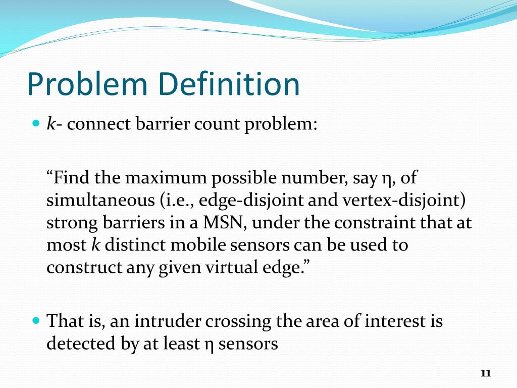 Problem Definition • k- connect barrier count problem: “Find the maximum possible number, say η, of simultaneous (i.e., edge-disjoint and vertex-disjoint) strong barriers in a MSN, under the constraint that at most k distinct mobile sensors can be used to construct any given virtual edge.” • That is, an intruder crossing the area of interest is detected by at least η sensors