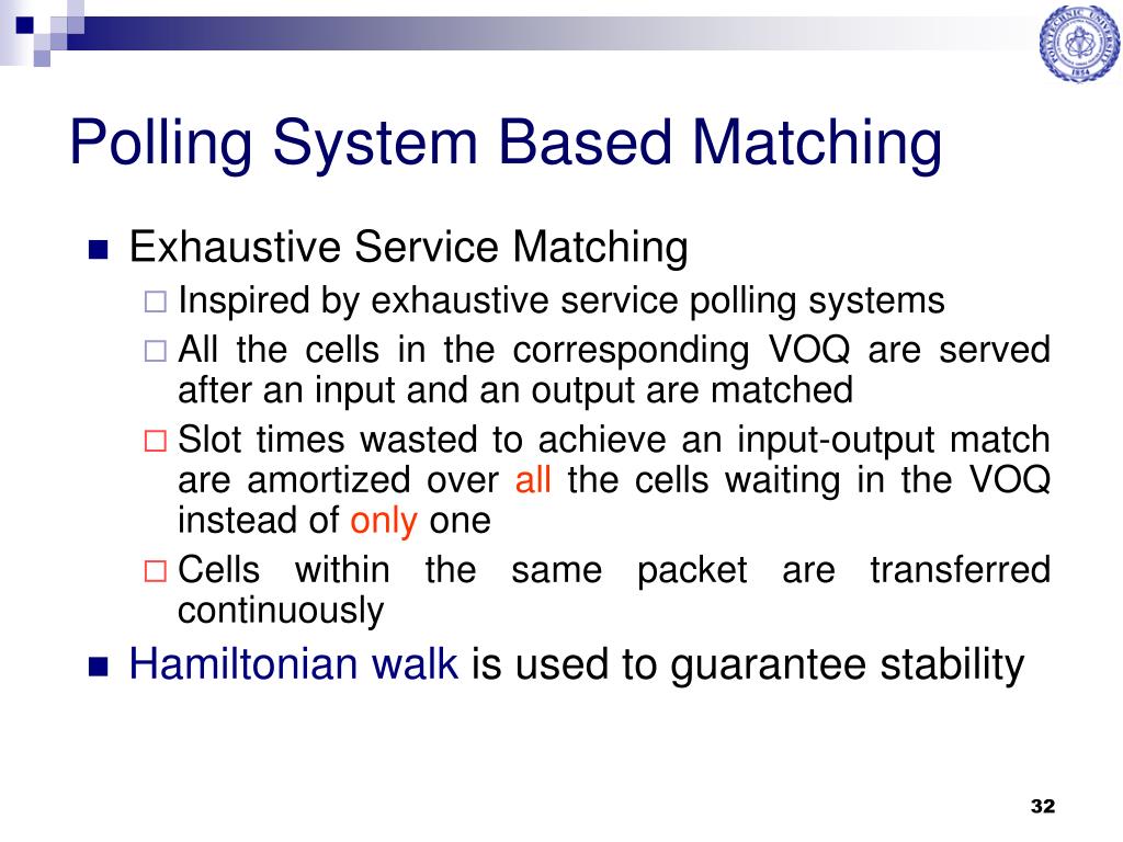 Polling System Based Matching • Exhaustive Service Matching • Inspired by exhaustive service polling systems • All the cells in the corresponding VOQ are served after an input and an output are matched • Slot times wasted to achieve an input-output match are amortized over all the cells waiting in the VOQ instead of only one • Cells within the same packet are transferred continuously • Hamiltonian walk is used to guarantee stability