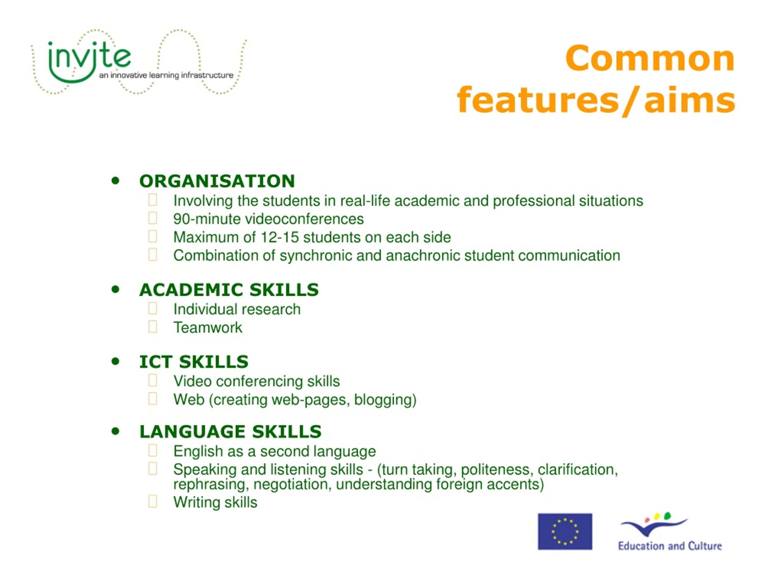 Common features/aims • ORGANISATION • Involving the students in real-life academic and professional situations • 90-minute videoconferences • Maximum of 12-15 students on each side • Combination of synchronic and anachronic student communication • ACADEMIC SKILLS • Individual research • Teamwork • ICT SKILLS • Video conferencing skills • Web (creating web-pages, blogging) • LANGUAGE SKILLS • English as a second language • Speaking and listening skills - (turn taking, politeness, clarification, rephrasing, negotiation, understanding foreign accents) • Writing skills