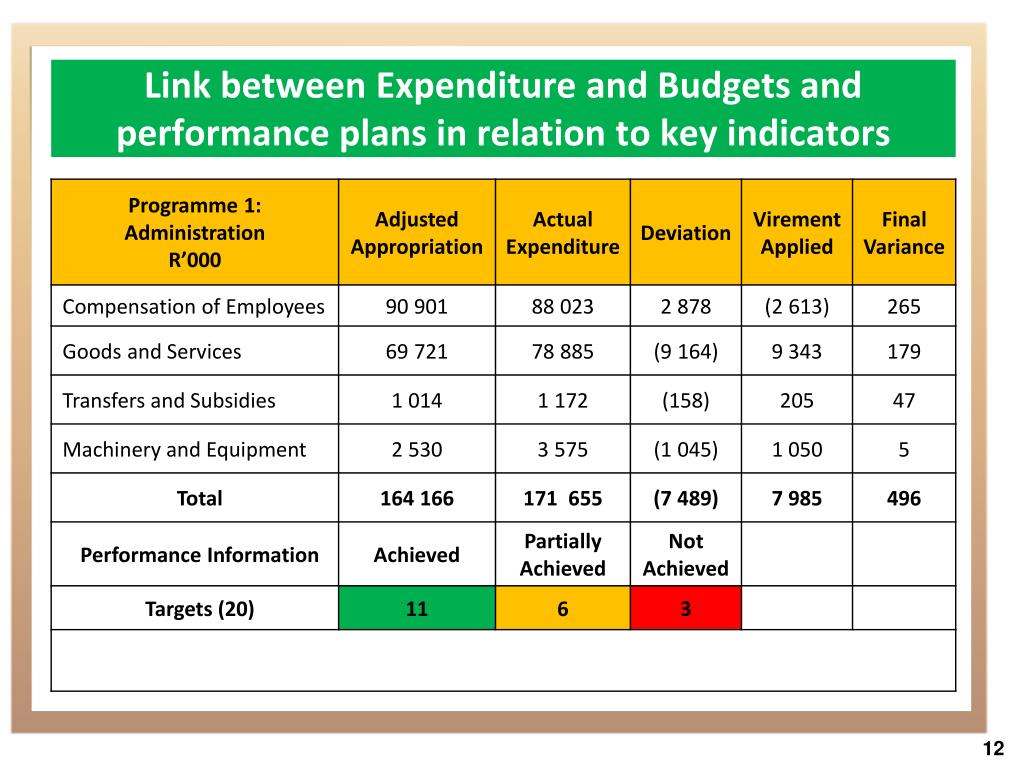 Link between Expenditure and Budgets and performance plans in relation to key indicators