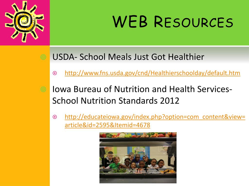 WEB Resources • USDA- School Meals Just Got Healthier • http://www.fns.usda.gov/cnd/Healthierschoolday/default.htm • Iowa Bureau of Nutrition and Health Services- School Nutrition Standards 2012 • http://educateiowa.gov/index.php?option=com_content&view=article&id=2595&Itemid=4678
