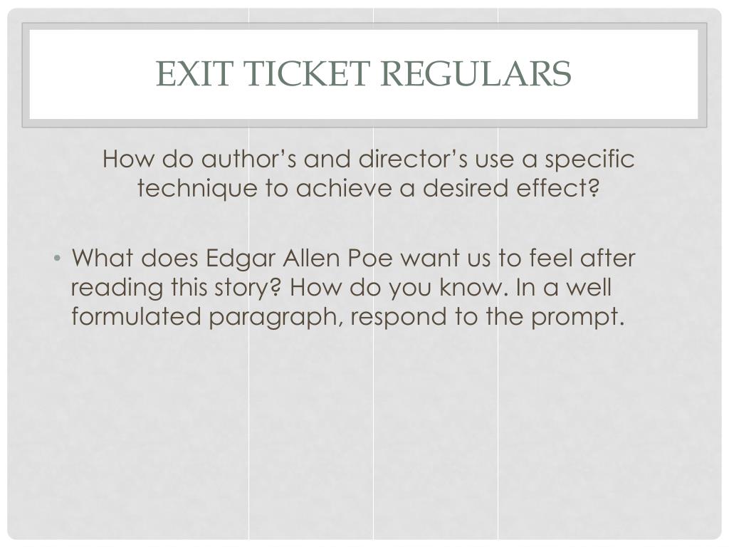 Exit Ticket Regulars How do author’s and director’s use a specific technique to achieve a desired effect? • What does Edgar Allen Poe want us to feel after reading this story? How do you know. In a well formulated paragraph, respond to the prompt.
