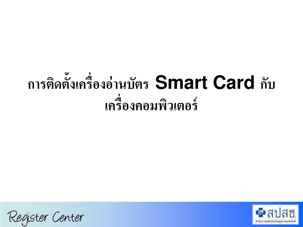 โปรแกรม Smart Card. สำนักงานหลักประกันสุขภาพแห่งชาติ. หัวข้อการอบรม. การติดตั้งเครื่องอ่านบัตร Smart Card การใช้งานโปรแกรม Smart Card. System Requirement. CPU Pentium 4 1 GB HD ( Request disk space 20 mb) RAM 512 Mb. Internet Connection ความเร็วต่ำสุด 56k