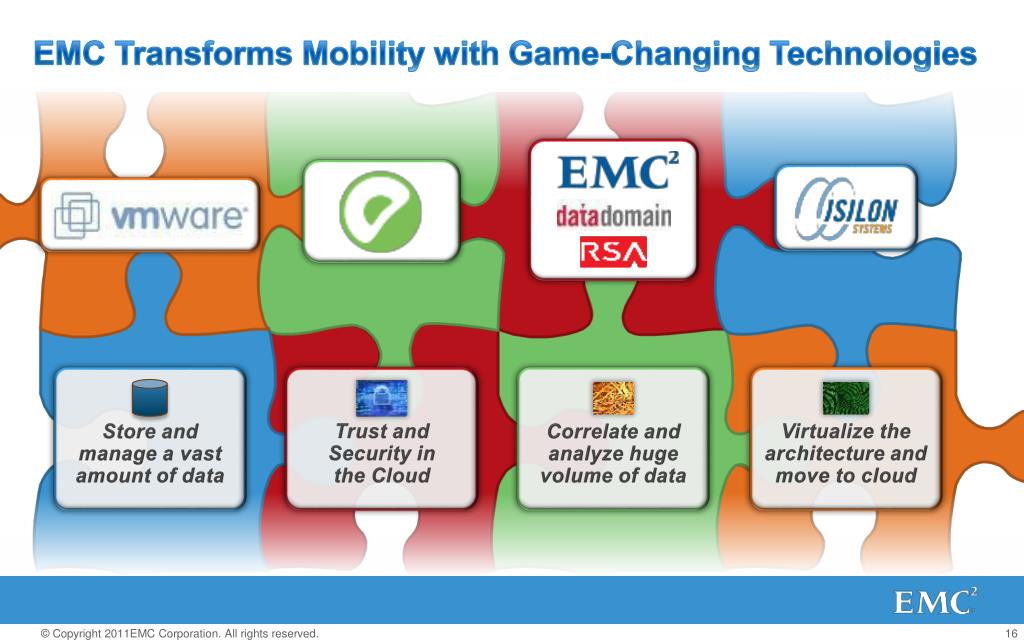 EMC Transforms Mobility with Game-Changing Technologies Store and manage a vast amount of data Trust and Security in the Cloud Correlate and analyze huge volume of data Virtualize the architecture and move to cloud