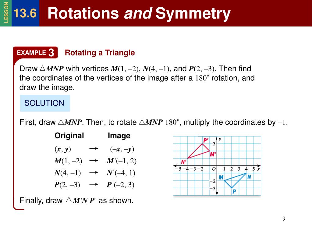 Rotations and Symmetry 13.6 LESSON 180˚ Rotations To rotate a point 180˚ about the origin, multiply each coordinate by –1. The image is the same whether you rotate the figure clockwise or counterclockwise. (x, y) (–x, –y)