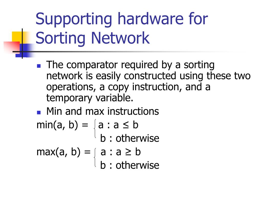 Supporting hardware for Sorting Network • The comparator required by a sorting network is easily constructed using these two operations, a copy instruction, and a temporary variable. • Min and max instructions min(a, b) = a : a ≤ b b : otherwise max(a, b) = a : a ≥ b b : otherwise