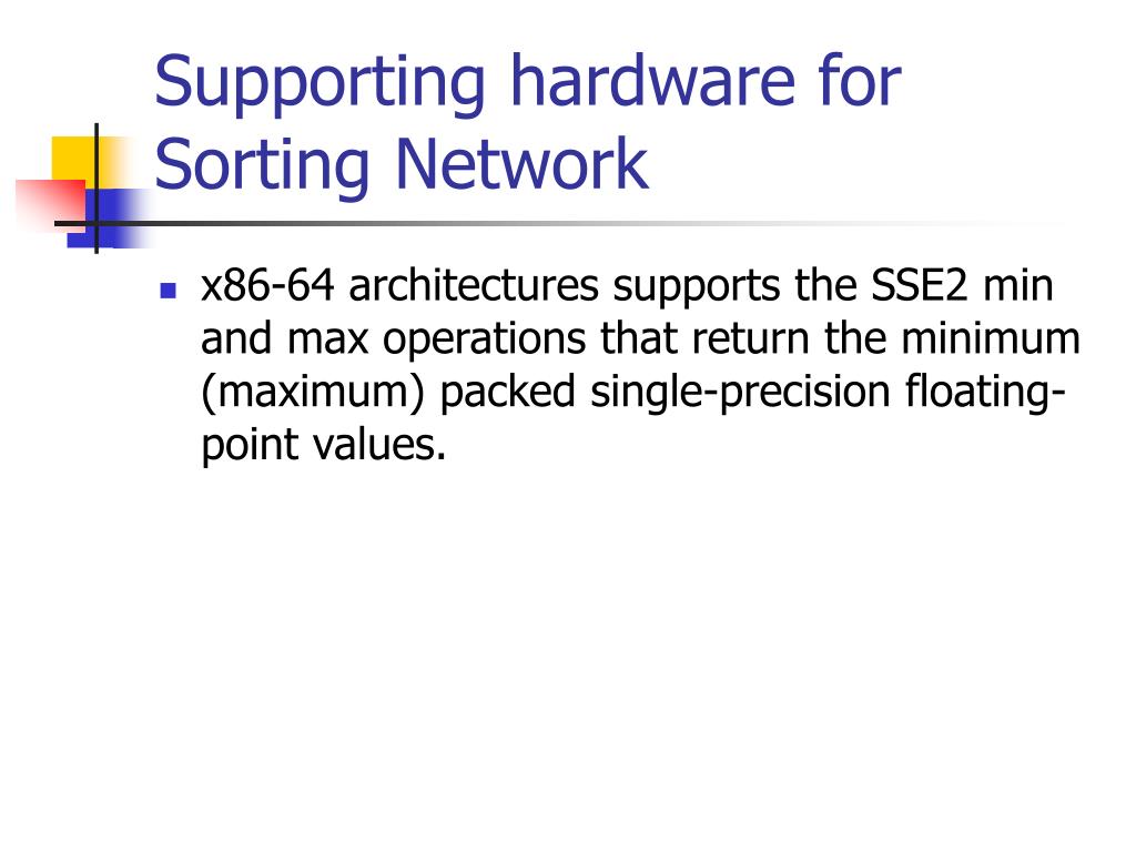 Supporting hardware for Sorting Network • x86-64 architectures supports the SSE2 min and max operations that return the minimum (maximum) packed single-precision floating-point values.