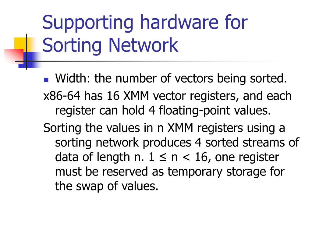 Supporting hardware for Sorting Network • Width: the number of vectors being sorted. x86-64 has 16 XMM vector registers, and each register can hold 4 floating-point values. Sorting the values in n XMM registers using a sorting network produces 4 sorted streams of data of length n. 1 ≤ n < 16, one register must be reserved as temporary storage for the swap of values.