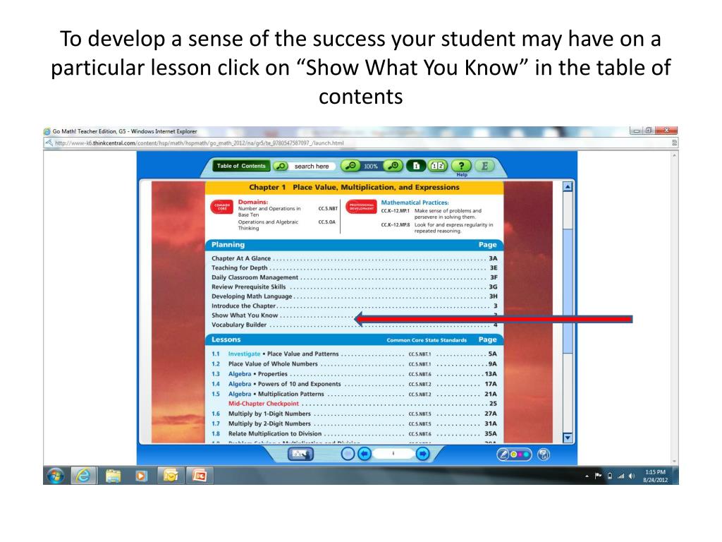 To develop a sense of the success your student may have on a particular lesson click on “Show What You Know” in the table of contents