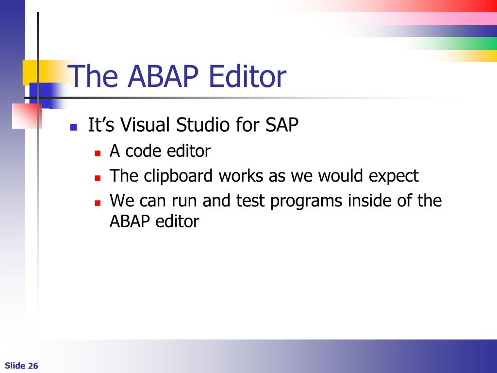 The ABAP Editor • It’s Visual Studio for SAP • A code editor • The clipboard works as we would expect • We can run and test programs inside of the ABAP editor
