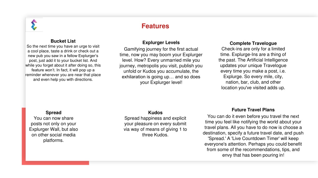 Features • Explurger Levels • Gamifying journey for the first actual time, now you may boom your Explurger level. How? Every unmarried mile you journey, metropolis you visit, publish you unfold or Kudos you accumulate, the exhilaration is going up… and so does your Explurger level! Bucket List So the next time you have an urge to visit a cool place, taste a drink or check out a new pub you saw in a fellow Explurger’s post, just add it to your bucket list. And while you forget about it after doing so, this feature won’t. In fact, it will pop up a reminder whenever you are near that place and even help you with directions. Complete Travelogue Check-ins are only for a limited time. Explurge-Ins are a thing of the past. The Artificial Intelligence updates your unique Travelogue every time you make a post, i.e. Explurge. So every mile, city, nation, bar, club, and other location you've visited adds up. • Future Travel Plans • You can do it even before you travel the next time you feel like notifying the world about your travel plans. All you have to do now is choose a destination, specify a future travel date, and push 'Spread.' A 'Live Countdown Timer' will keep everyone's attention. Perhaps you could benefit from some of the recommendations, tips, and envy that has been pouring in! Kudos Spread happiness and explicit your pleasure on every submit via way of means of giving 1 to three Kudos. Spread You can now share posts not only on your Explurger Wall, but also on other social media platforms.