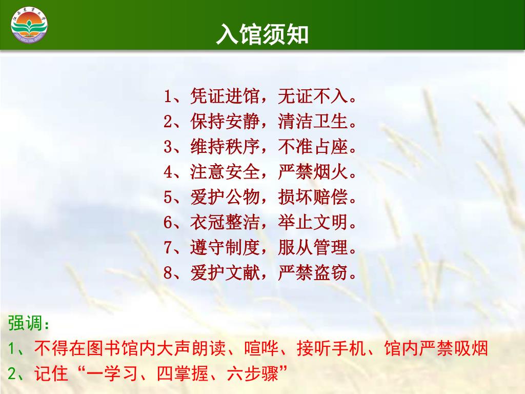 1、凭证进馆,无证不入。 2、保持安静,清洁卫生。 3、维持秩序,不准占座。 4、注意安全,严禁烟火。 5、爱护公物,损坏赔偿。 6、衣冠整洁,举止文明。 7、遵守制度,服从管理。 8、爱护文献,严禁盗窃。 强调: 1、不得在图书馆内大声朗读、喧哗、接听手机、馆内严禁吸烟 2、记住“一学习、四掌握、六步骤” 入馆须知