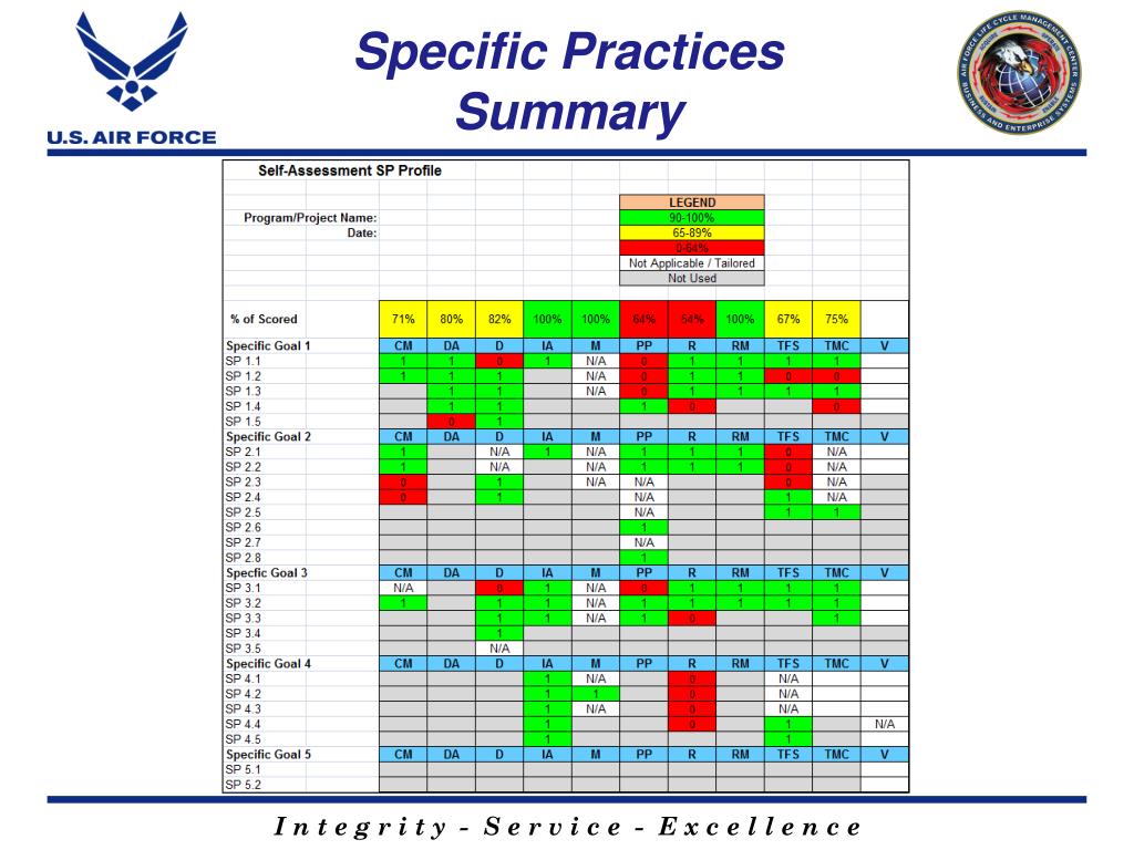 Self-Assessment Overview • An AF SEAM Self-Assessment is conducted by Program/Project Personnel and matrix support personnel • The Self-Assessment is an opportunity to: • Ensure existence of disciplined systems engineering processes; demonstrated ability to execute processes • Identify outputs (work products) from the process • Identify strengths / best practices exercised by programs/projects • Identify opportunities for program/project or process improvement