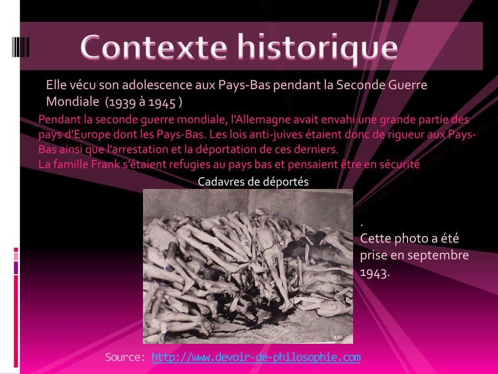 Contexte historique Source: http://www.devoir-de-philosophie.com Elle vécu son adolescence aux Pays-Bas pendant la Seconde Guerre Mondiale (1939 à 1945 ) Pendant la seconde guerre mondiale, l'Allemagne avait envahi une grande partie des pays d’Europe dont les Pays-Bas. Les lois anti-juives étaient donc de rigueur aux Pays-Bas ainsi que l’arrestation et la déportation de ces derniers. La famille Frank s’étaient refugies au pays bas et pensaient être en sécurité Cadavres de déportés . Cette photo a étéprise en septembre 1943.