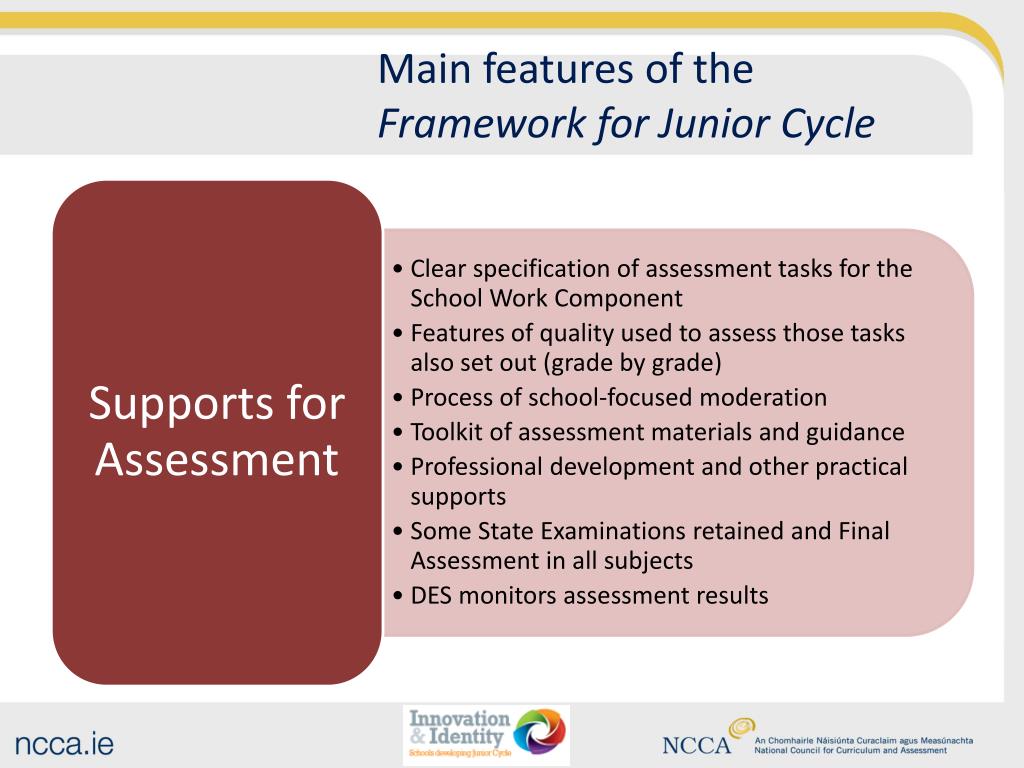 Why change? • ESRI research - evidence base for junior cycle review • 1st year, 2nd year, 3rd year • nature of engagement • Request for advice from Minister and DES • Innovation and Identity- Ideas for a New Junior Cycle (2010) discussion paper