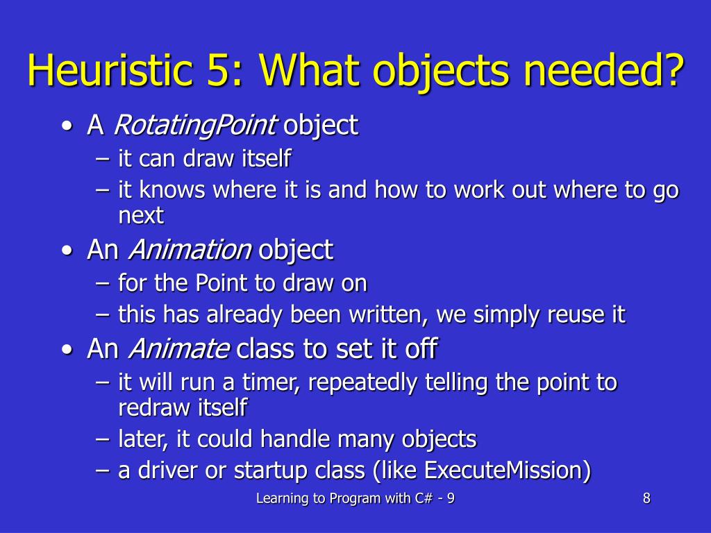 Heuristic 5: What objects needed? • A RotatingPoint object • it can draw itself • it knows where it is and how to work out where to go next • An Animation object • for the Point to draw on • this has already been written, we simply reuse it • An Animate class to set it off • it will run a timer, repeatedly telling the point to redraw itself • later, it could handle many objects • a driver or startup class (like ExecuteMission) Learning to Program with C# - 9