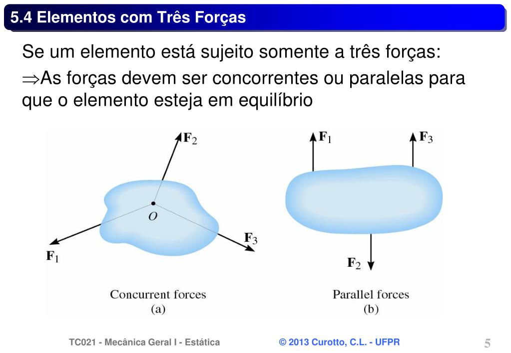 5.4 Elementos com Três Forças Se um elemento está sujeito somente a três forças: As forças devem ser concorrentes ou paralelas para que o elemento esteja em equilíbrio