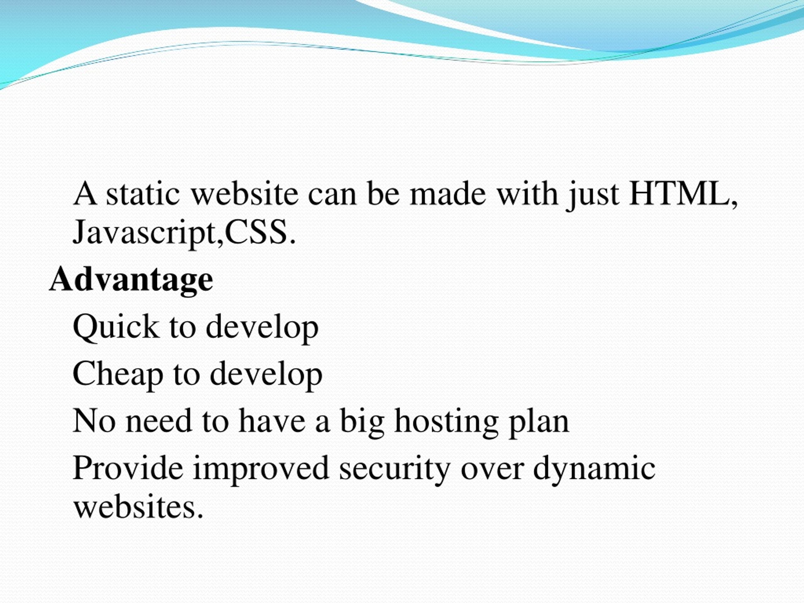 A static website can be made with just HTML, Javascript,CSS. Advantage Quick to develop Cheap to develop No need to have a big hosting plan Provide improved security over dynamic websites.