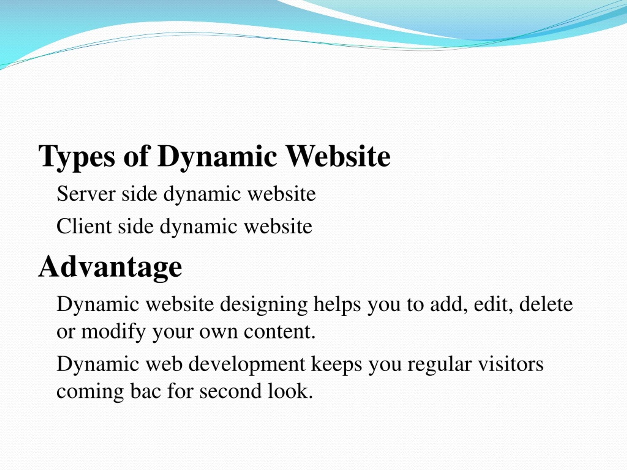 Types of Dynamic Website Server side dynamic website Client side dynamic website Advantage Dynamic website designing helps you to add, edit, delete or modify your own content. Dynamic web development keeps you regular visitors coming bac for second look.
