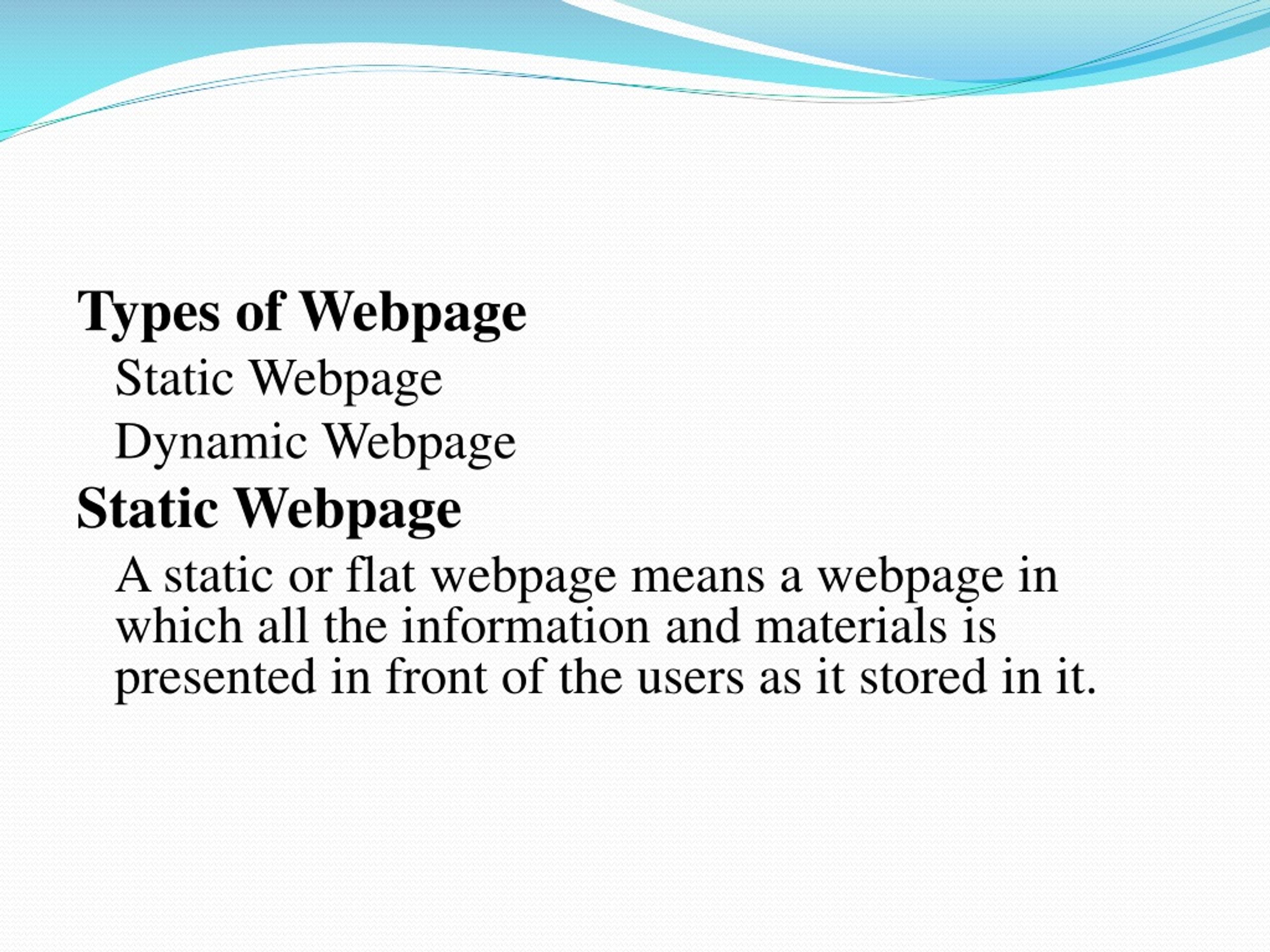 Types of Webpage Static Webpage Dynamic Webpage Static Webpage A static or flat webpage means a webpage in which all the information and materials is presented in front of the users as it stored in it.