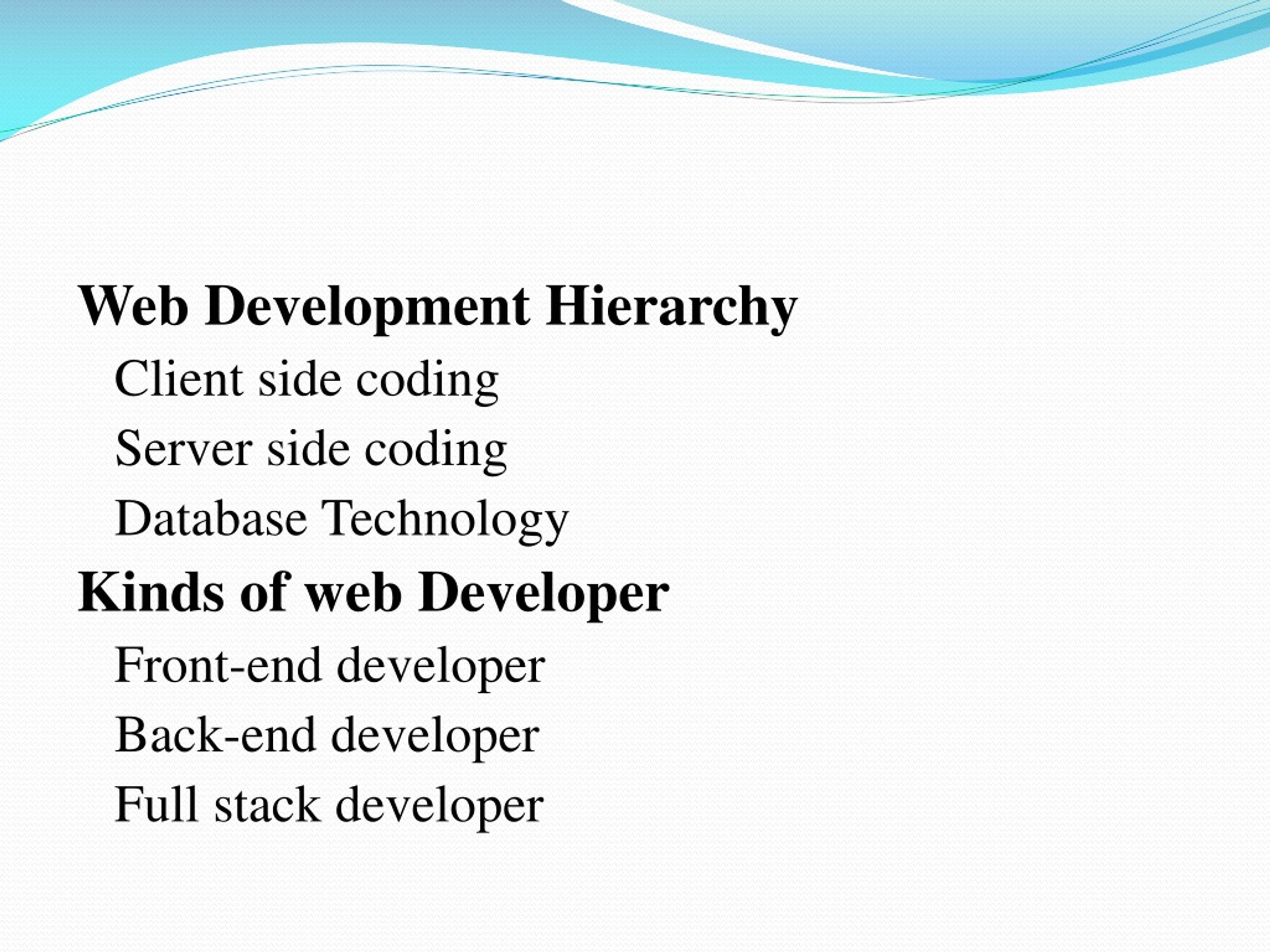 Web Development Hierarchy Client side coding Server side coding Database Technology Kinds of web Developer Front-end developer Back-end developer Full stack developer