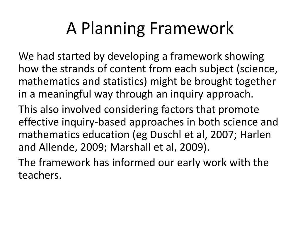 A Planning Framework We had started by developing a framework showing how the strands of content from each subject (science, mathematics and statistics) might be brought together in a meaningful way through an inquiry approach. This also involved considering factors that promote effective inquiry-based approaches in both science and mathematics education (egDuschl et al, 2007; Harlen and Allende, 2009; Marshall et al, 2009). The framework has informed our early work with the teachers.
